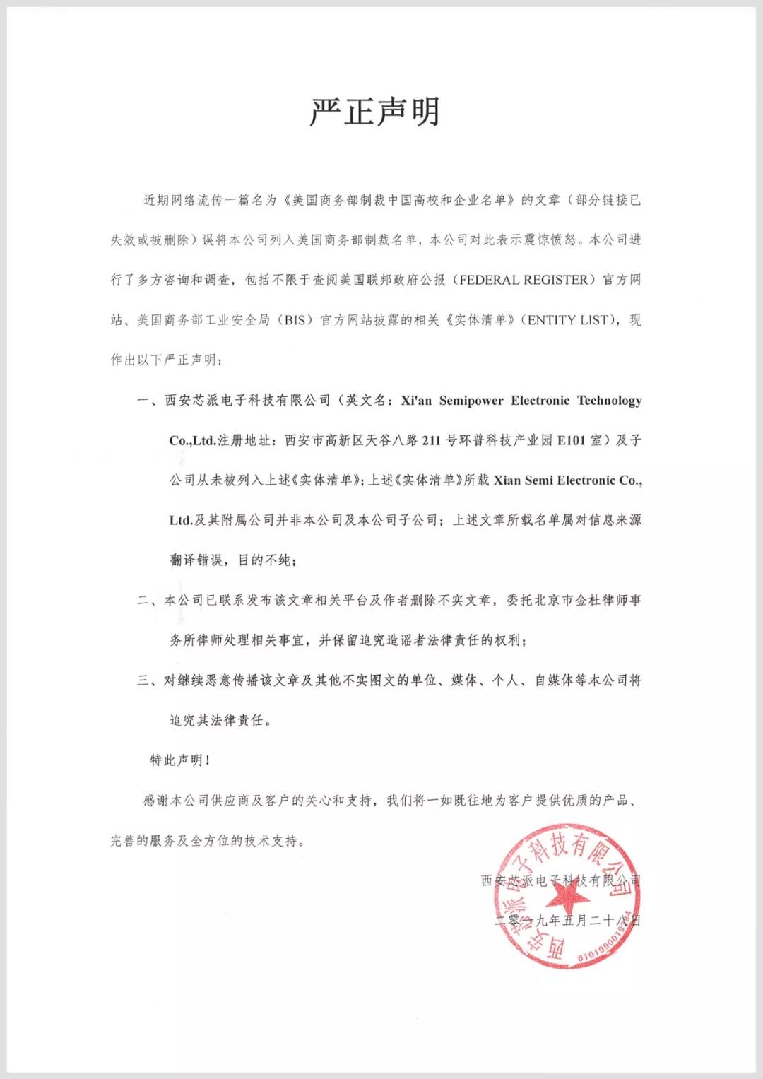 一、 西安芯派電子科技有限公司(英文名:Xi'an Semipower Electronic Technology Co.,Ltd.注冊(cè)地址:西安市高新區(qū)天谷八路211號(hào)環(huán)普科技產(chǎn)業(yè)園E101室)及子公司從未被列入上述《實(shí)體清單》;上述《實(shí)體清單》所載Xian Semi Electronic Co., Ltd.及其附屬公司并非本公司及本公司子公司;上述文章所載名單屬對(duì)信息來(lái)源翻譯錯(cuò)誤,目的不純;