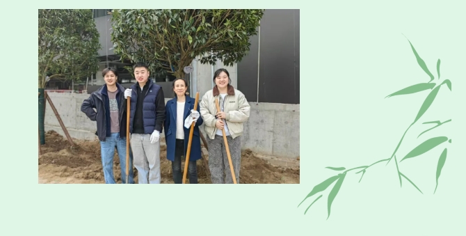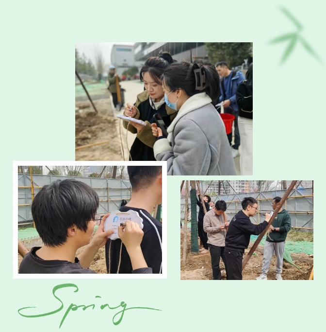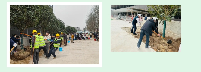 參觀結束后,大家領取工具、分組協作,在園區景觀帶栽種?國槐、金桂?。各小組揮鍬破土、扶苗填坑、培土澆水,每一棵樹苗的扎根都凝聚著團隊力量?。