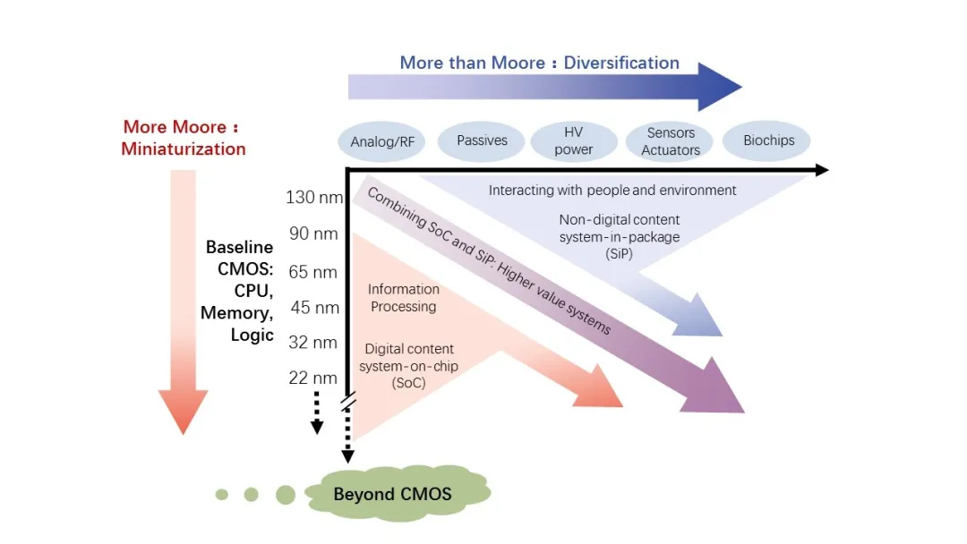 為此, ITRS組織針對半導體產業中遠期發展的挑戰,在技術路線制定上,提出選擇兩種發展方式(如圖1):一是繼續沿著摩爾定律按比例縮小的方向前進,專注于硅基CMOS技術;二是按“后摩爾定律”的多重技術創新應用向前發展,即在產品多功能化(功耗、帶寬等)需求下,將硅基CMOS和非硅基等技術相結合,以提供完整的解決方案來應對和滿足層出不窮的新市場發展。