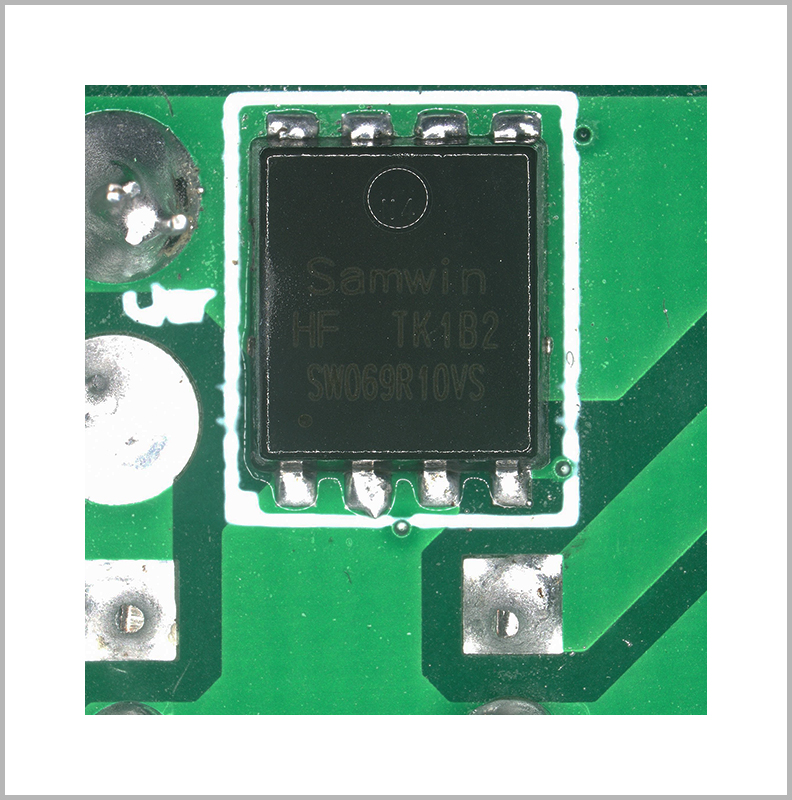 該適配器DEMO板上的同步整流MOSFET采用了“西安芯派電子科技有限公司”的 SW069R10VS, SW069R10VS是一顆SGT 工藝的低壓MOSFET ,其內阻為7.1mΩ,耐壓為100V,開關損耗小,導通內阻低,可以有效的提升PD適配器的效率,是芯派科技專門針對PD方向應用推出的一顆SGT低壓MOSFET,其規格參數入下圖所示。