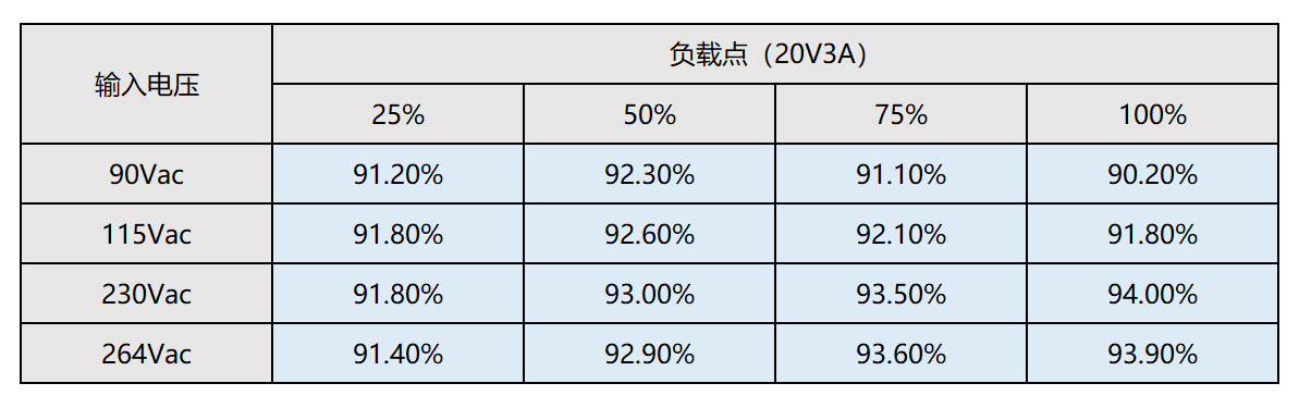 通過對該DEMO板的測試,發現其滿載最優效率點出現在230V輸入,20V滿載輸出時,其最優效率為94%。滿載最差效率點出現在264V輸入,5V滿載輸出時,效率為89.3%。整個適配器在全電壓輸入、全負載輸出段效率一致性較高,綜合性能極優。